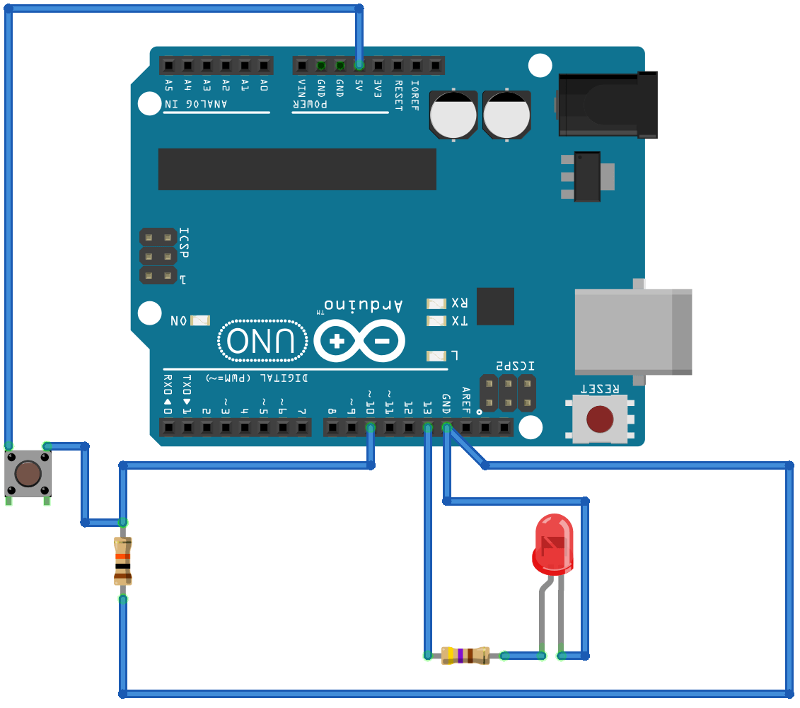 LED’i kontrol etmek için, bir buton kullanacaksınız. Buton serbest bırakıldığında karta 0V, basıldığında karta 5V göndermelidir. Aşağıdaki şekil, butonun Arduino kartına nasıl bağlanacağını gösterir:
